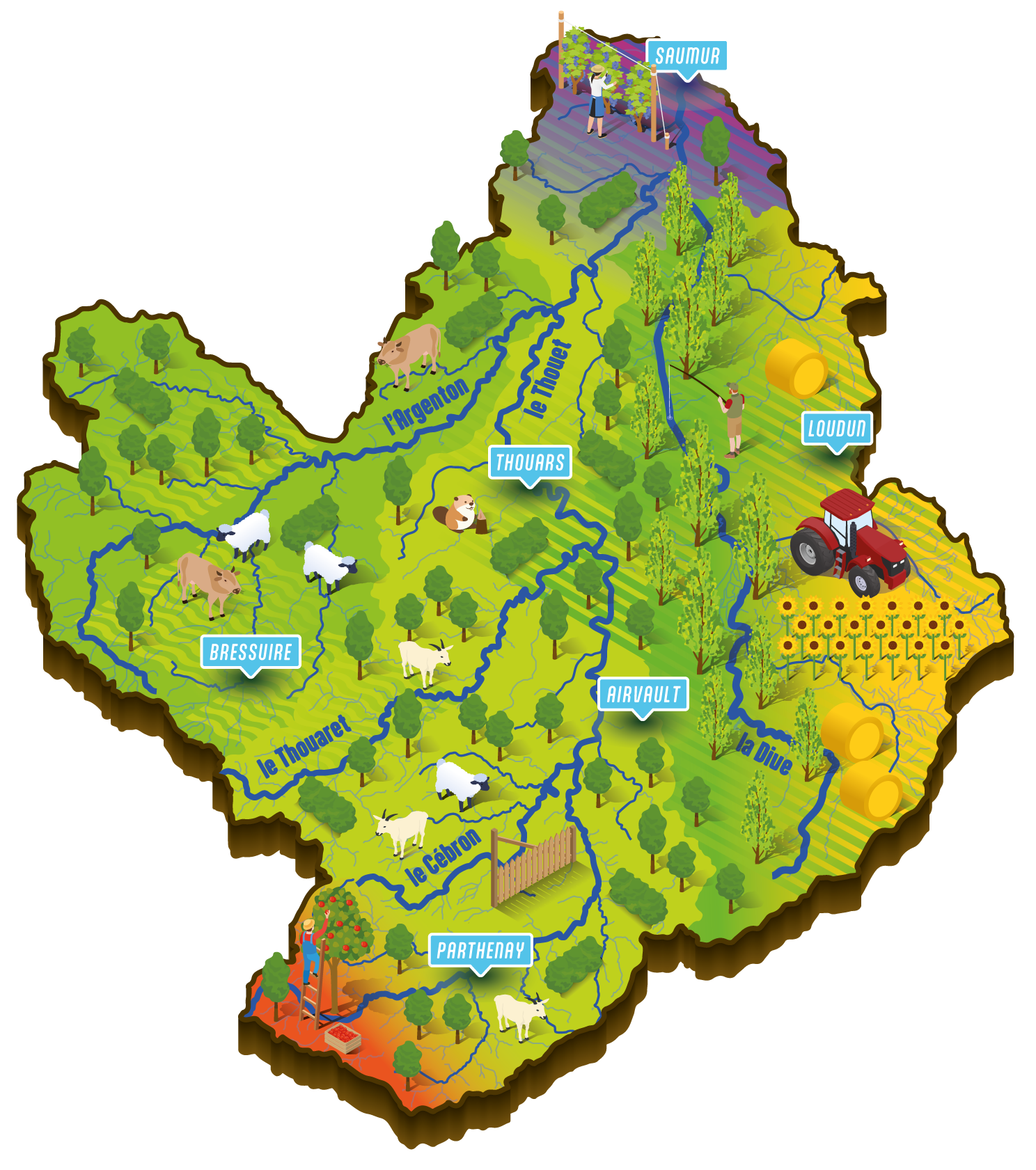 Le bassin versant du Thouet couvre un territoire d’environ 3 375km² et concerne 169 communes, 9 EPCI, 3 Départements (Deux-Sèvres, Vienne et Maine-et-Loire) et 2 régions (Nouvelle-Aquitaine, Pays de la Loire).